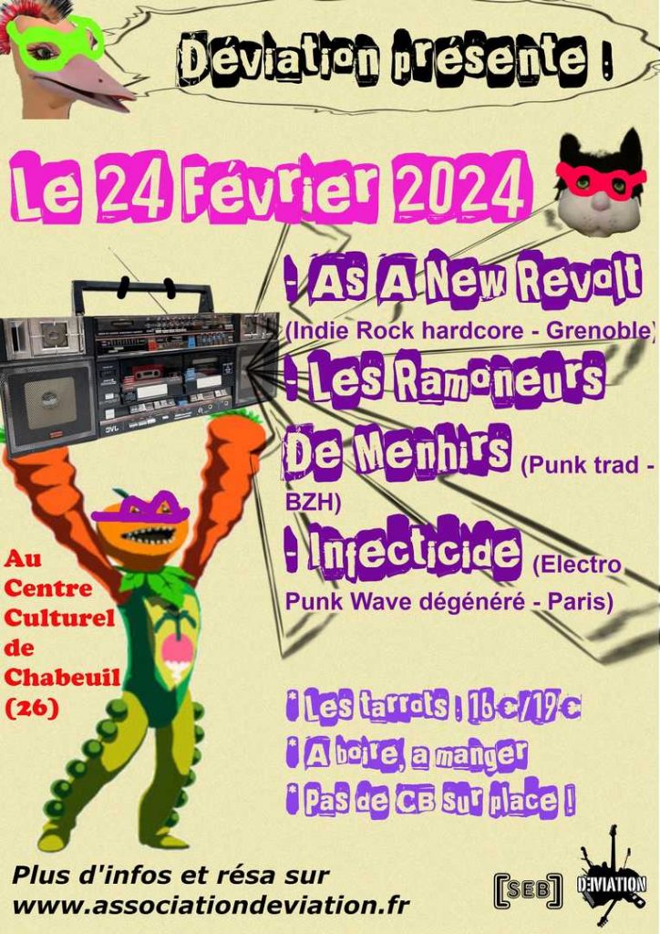 L’association Déviation, organisatrice historique du Festival Rencontres entre les mondes proposera, le samedi 24 février 2024 au Centre culturel de Chabeuil, dans la Drôme, une soirée de concerts qui promet d’être punk et rock ! Au programme de cet événement, pas moins de trois concerts, et avec de beaux noms venus d’un peu partout en France !