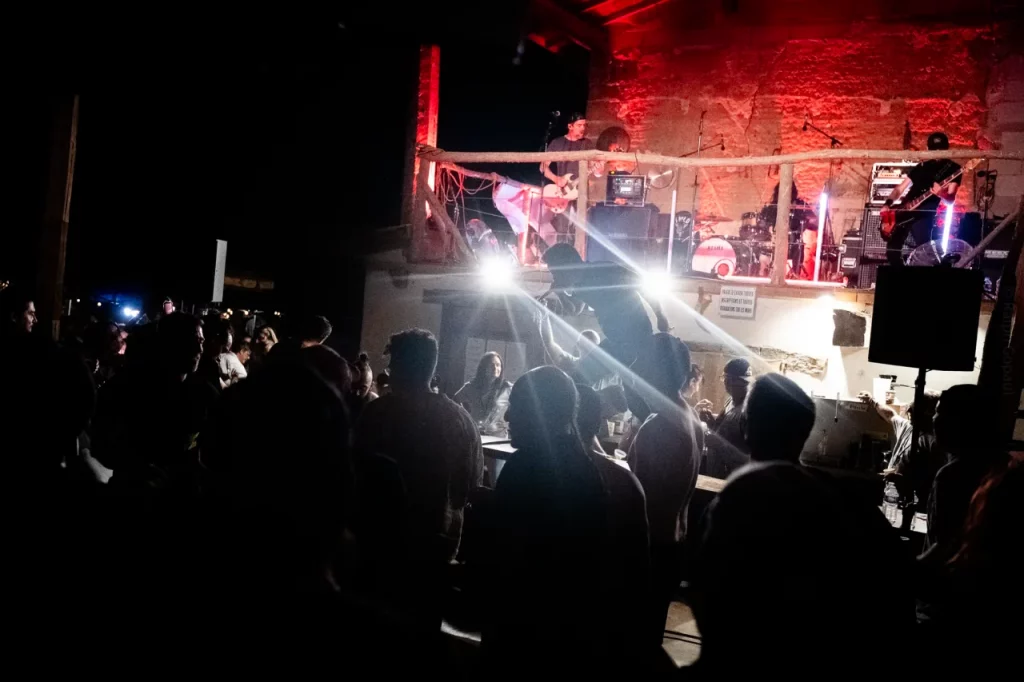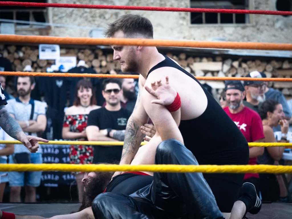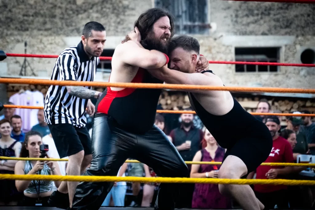Après l’entrée, nous avons à droite le Merch, à gauche des exposants puis le bar situé juste en dessous de la scène. En effet, la particularité du lieu est que la scène est en hauteur, littéralement à ce qui pourrait être considéré au premier étage, et la fosse en bas, sur le côté du corps de ferme en U. En face de l’entrée, nous avons la surprise du soir : un ring de catch et plus au fond de la cour carrée la « cuisine » pour les burgers et frites.