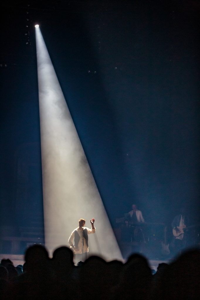 Après un rapide changement de plateau, celui que toute l’assistance attendait depuis, parfois un long momment — certains étaient présents depuis 18 heures —, est arrivé. Nous vous épargnerons le détail de ce moment où il entre en scène, car la mise en scène se vit et ne se raconte pas. C’est à un spectacle époustoufflant, ébouriffant que nous avons assisté. Le public était en liesse, en extase, en transe même. Leur « chouchou » était là, devant eux, et chantait des titres qu’eux-mêmes connaissaient parfois par coeur. C’était beau, c’était grand, c’était fort. C’était un pur instant de bonheur que l’on pouvait lire dans les regards pleins d’étoiles des spectateurs. Après deux heures de chansons, le showman a libéré son public qui a pu retourner à ses Pénates des souvenirs plein la tête.