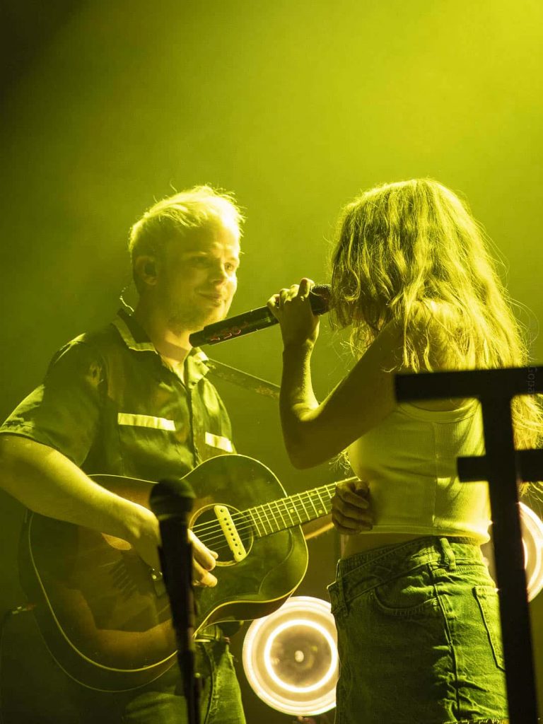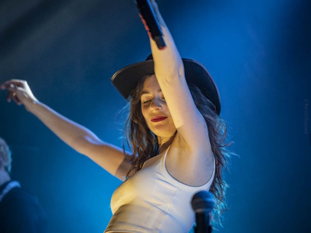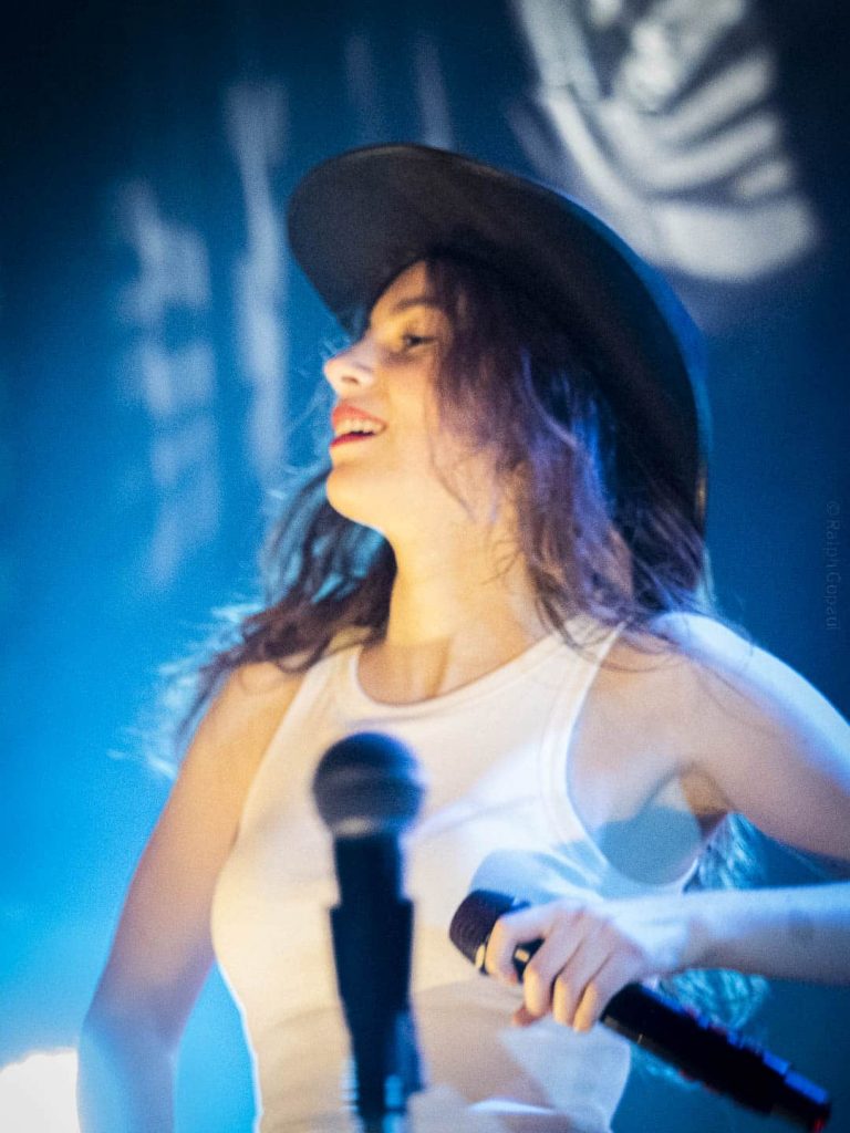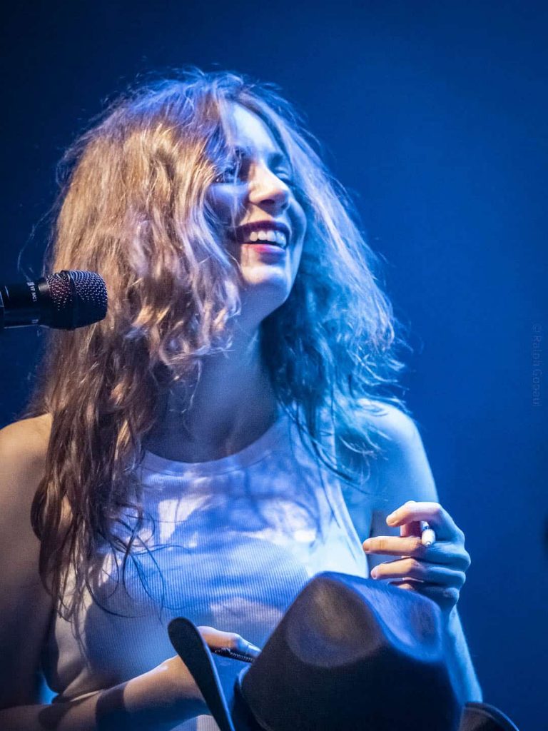 Solitude imprévue puis Berceuse et Insomnies (et son clip acrobatique). C’était sa chanson triste avant la partie plus festive qui démarre avec une chanson pour oser avouer son crush À peu près. Le public s’échauffe ensuite sur Les silences. Puis nous avons Side by side avant que n’arrive la neuvième de la soirée sur laquelle il faut chanter très fort : Q ! Adé fait sautiller toute la salle avant d’attaquer le titre Avec des si. Puis le groupe quitte la scène … Et revient avec Bonne année. Adé nous rappelle qu’ici il faut aimer l’Amérique. Un moment qui nécessite du calme ! Elle nous offre une reprise en toute intimité de Jolene de Dolly Parton, entourée de ses musiciens tous en acoustique. S’en suit Sunrise de Nora Jones puis Jimmy de Moriarty sur laquelle Adé joue la partie harmonica. Un très bon medley Made in USA ! Nous revoilà ensuite avec son album sur le titre Tout Savoir sur lequel elle revêt son désormais iconique chapeau de cowboy : « C’est le Far-West à Lyon ce soir ! ». Adé offre son chapeau dédicacé aux enfants situés devant et c’est la dernière chanson qui arrive, déjà … Elle adresse ses remerciements pour le public et termine avec Si tu partais, une chanson très triste.