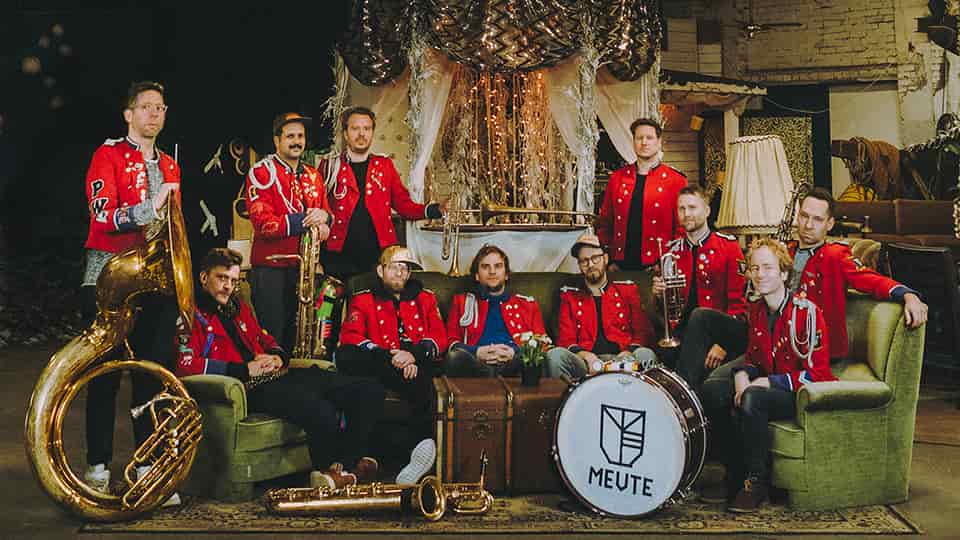 « MEUTE ? » Me direz-vous ? C’est une joyeuse fanfare techno analogique « unplugged » composée de onze membres. Originaire du quartier de Sankt Pauli (St. Paul) à Hambourg, en Allemagne, le groupe reprend et arrange des morceaux de techno, house et deep house de DJs connus et les enrichit de rythmes électroniques produits par des instruments de fanfare.