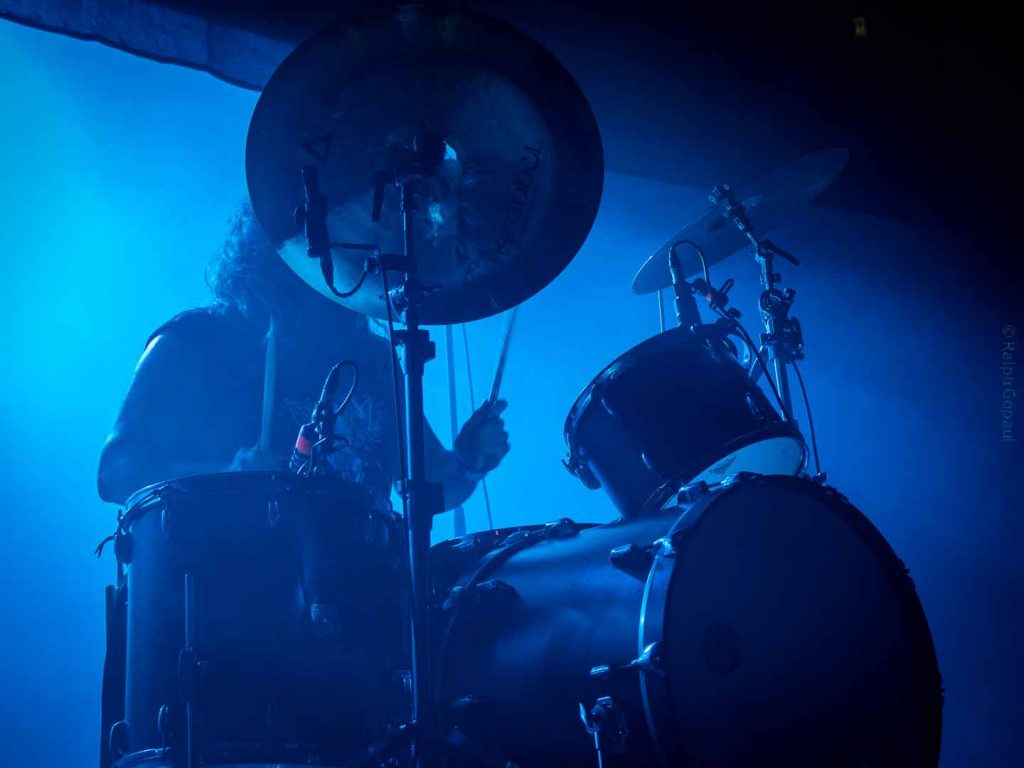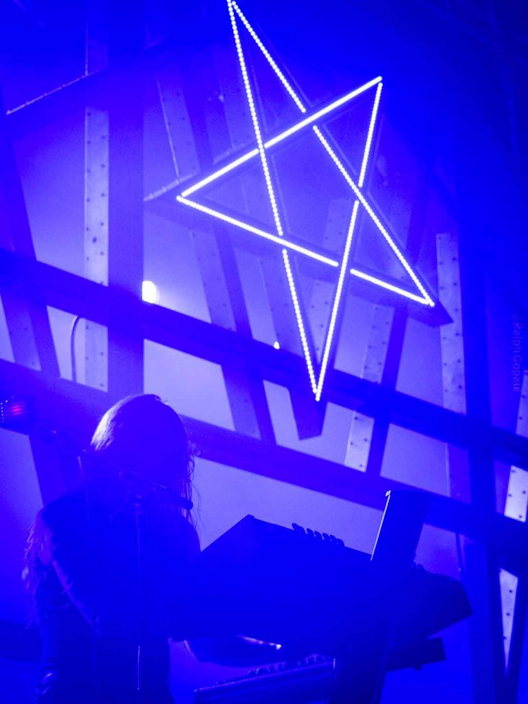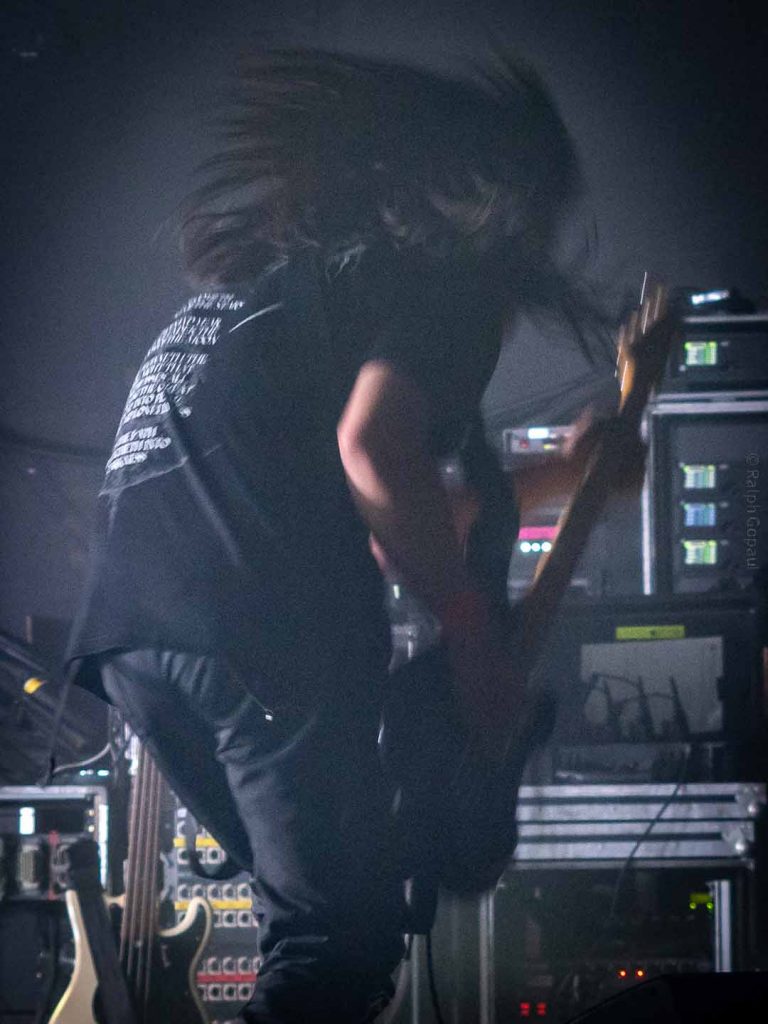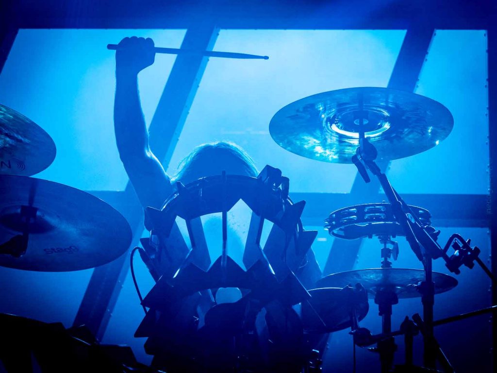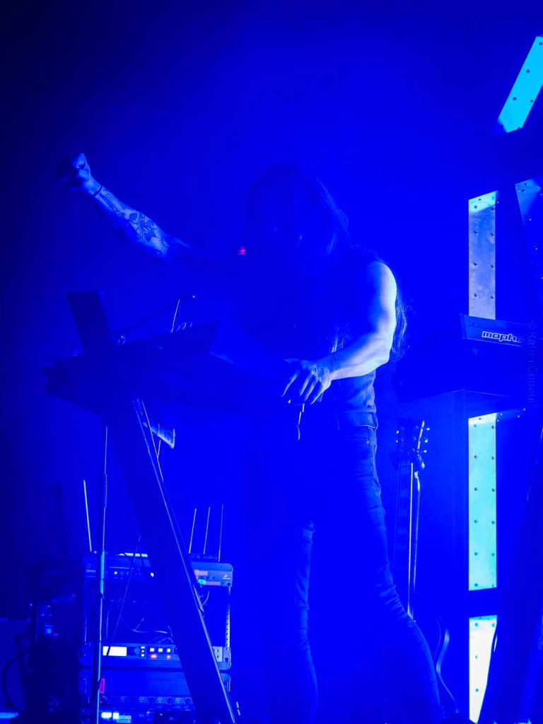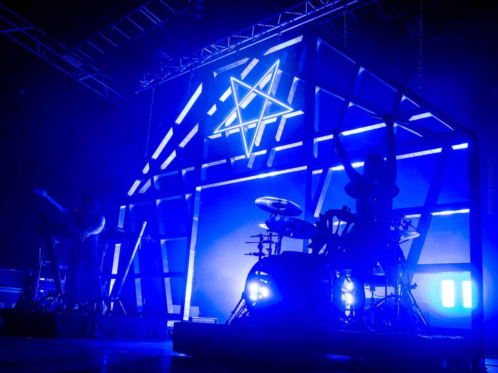 Sous la charpente arborée de l’étoile sataniste, le symbole du groupe, James Kent et son batteur, se présentent triomphalement à nous, un petit moment à se baigner sous les clameurs et le beat démarre. La musique de la formation française, portée et créé depuis 2012 par le susnommé James qui a été imprégné par la musique issue de synthétiseurs avant de se mettre au métal pour finalement proposer une synthèse des deux avec son projet Perturbator, alterne entre les sonorités 80s des synthés douces et rythmées et les sons plus modernes et énervés venant de tout l’impressionnant attirail de James comprenant multiples claviers, tables de mixage et même une guitare, le tout accompagné d’une batterie qui ne se repose jamais. Ainsi le public reste captivé, entre la majesté du Synth et la fureur du Metal Indus qui s’alternent, ou se mélangent. L’on a pu de fait constater une tendance dans la fosse du nombre de crowdsurfeurs qui augmente en fonction de la croissance des beats par minute. La scénographie n’était pas non plus en reste, la charpente s’illumine telle une église qui aurait été visitée par un sataniste alors que les deux compères musiciens restent deux silhouettes indiscernables.