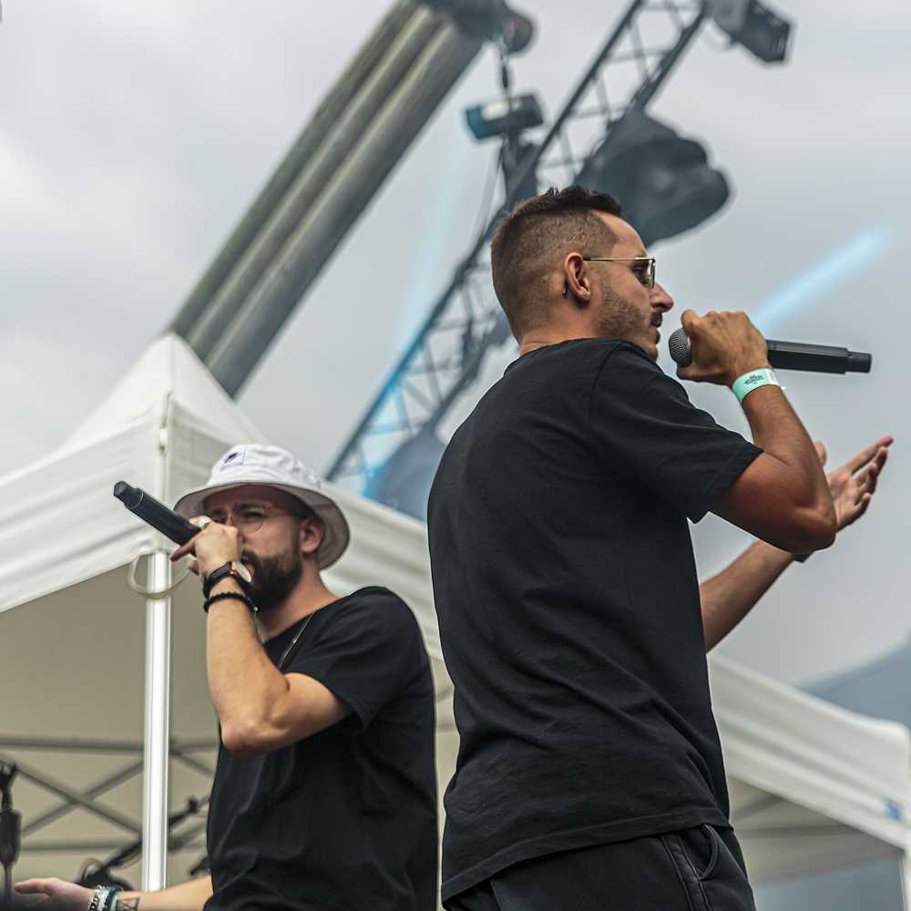 Puis est arrivé sur scène le premier artiste de la soirée : Mes’Pri, un rappeur drômois qui, accompagné de son comparse Daïren, a eu la charge d’ouvrir le festival. Mission accomplie puisque le public, qui commençait à arriver en envahissant les gradins du théâtre de verdure et en s’installant dans la fosse, a eu l’air d’apprécier, les accompagnant parfois au chant. C’est une belle découverte d’un duo d’artistes locaux (ils sont originaires de Romans-sur-Isère).