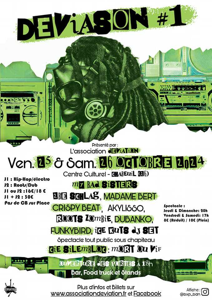 L’association Déviation, sise dans la petite ville drômoise Chabeuil, organisera, les vendredi 25 et samedi 26 octobre 2024, la première édition de son nouveau projet : Déviason ! Sur deux soirées, cet événement neuf nous proposera de venir découvrir, sur la scène du centre culturel de Chabeuil, pas moins de huit concerts. Les styles représentés seront variés. Nous aurons droit à du hip-hop et du reggae (roots, dub et électro). Les artistes choisis sont de belle qualité et nul ne doute que chacun vivra de beaux et grands moments. Vous pourrez trouver, sur place, tout ce qu’il vous faudra pour vous désaltérer (bar) et vous alimenter (food-truck). Les cartes bancaires ne seront pas prises sur place : prévoyez du liquide.