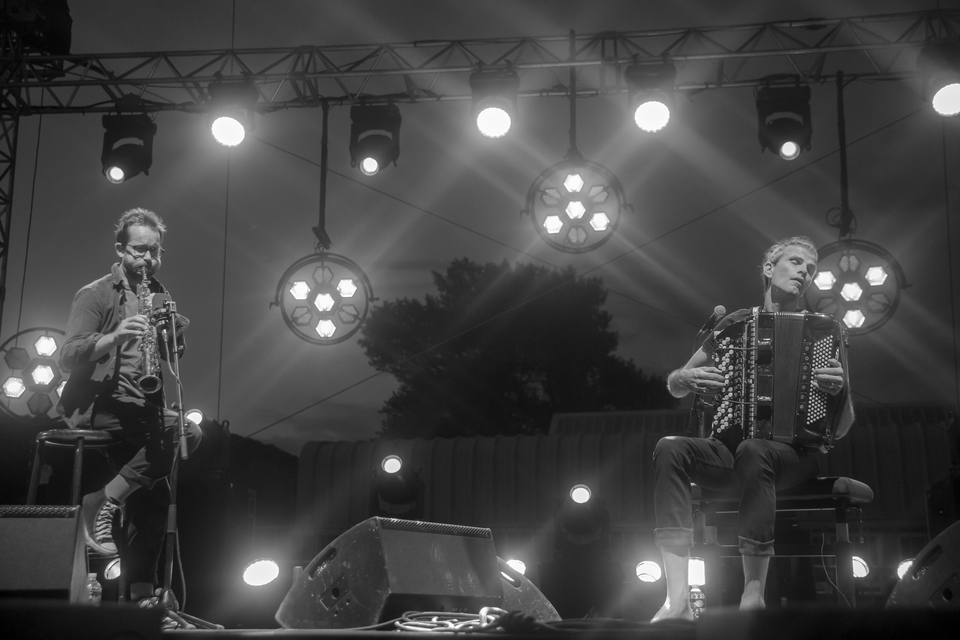 Puis est venu le temps, non des rires et des champs, mais de la clarinette d’Émile Parisien et de l’accordéon de Vincent Peirani. Ils ont débuté le concert « par un premier morceau », comme l’a si bien dit Vincent en introduction. Puis les notes guillerettes de l’accordéon et celles plus graves de la clarinette ont virevolté pour s’envoler dans la nuit drômoise. Deux artistes que nous avions vu ici même l’an dernier et que nous avons eu plaisir à retrouver.