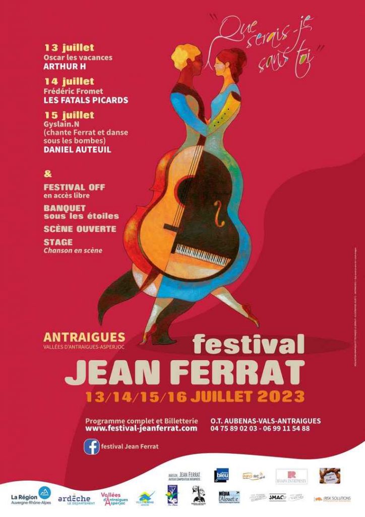 Le Festival Jean Ferrat est l’un des événements estivaux incontournables du département de l’Ardèche. Celui-ci se déroule chaque année à la mi-juillet à Antraïgues-sur-Volane et propose une programmation des plus attrayantes pour les amateurs de chanson française en général et de Jean Ferrat en particulier. La douzième édition, qui aura lieu sur quatre journées, du jeudi 13 au dimanche 16 juillet 2023, ne dérogera pas à la règle. À noter que, concomitamment au festival, se déroule un « off » qu’il est de bon ton de suivre de près. Cependant, nous ne vous donnerons pas le programme de ce dernier, mais sachez qu’il est assez dense. Voici donc, ci-dessous, les artistes invités à se produire sur la scène du Festival Jean Ferrat.