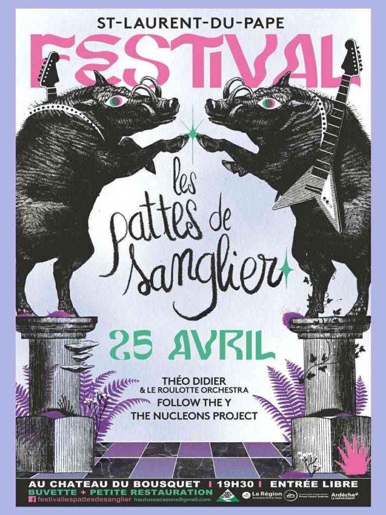 En cette année 2026, le festival Les Pattes de Sanglier propose de nous accueillir sur une unique soirée qui se tiendra le samedi 25 avril dans le parc du Château du Bousquet, sis sur la commune de Saint-Laurent-du-Pape. En accès libre, il nous offrira, outre des activités diverses et variées, pas moins de trois concerts. Des victuailles et breuvages de choix seront accessibles sur place afin de vous sustenter et vous réhydrater. Tout se déroulera dans une ambiance conviviale, familiale et festive et chacun pourra trouver son bonheur à cette occasion.