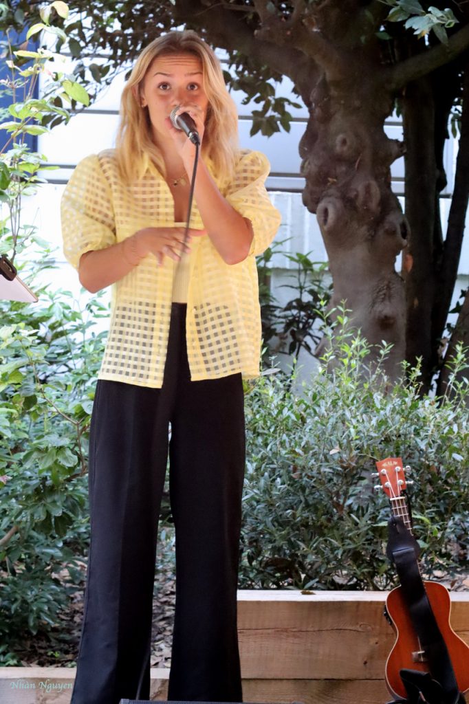 Seulement accompagnée de son inséparable smartphone et d’une tablette, elle gère, commande le son, lance les accompagnements et chante ! Elle est impressionnante. D’une voix qui rappelle Amy Winehouse, sans excès, elle chante juste et bien. Des chants qui sortent des tripes de son âge, de ses amours ou de ses doutes mais beaucoup dans la langue de Shakespeare aussi. Elle a tenu une heure et demie avec une courte pause, le temps de reprendre son souffle. Seule ombre au tableau : quelques irrespectueux étaient venus faire leurs ‘affaires’, parlant haut et fort, à quelques pas de l’artiste.