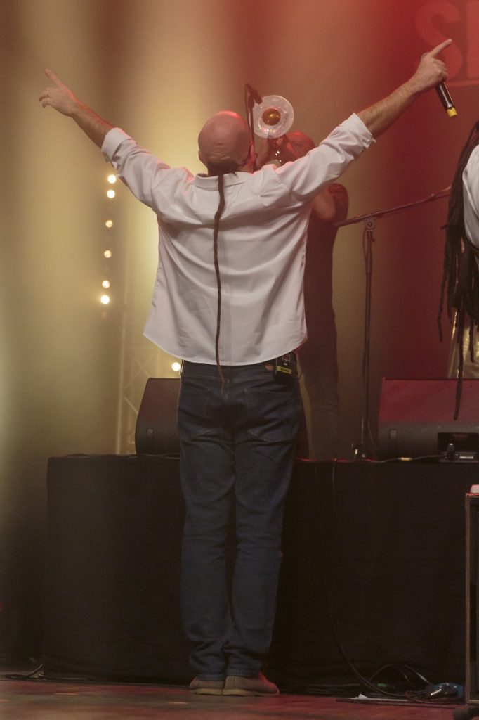 Vanupié est revenu ensuite, chanter Le Futur avec Riké. Un spectacle grandiose, gigantesque se déroulait sous nos yeux. Puis vint le rappel, et le public de chanter à nouveau Joyeux anniversaire. La suite de la soirée s’est déroulée en « acoustique », assis tranquillement sous une lumière intimiste, sans les cuivres, sans les percussions, avec guitare, basse, harmonica, avant de repartir de plus belle, avec tout le monde sur scène, et avec beaucoup de plaisir lors du second rappel. Mike arrive aux remerciements. Il remercie tout le monde : ingénieurs, musiciens jouant tour à tour, encadrement, public, et Riké le remercie… Cela fait, tout le monde est passé sur le devant de la scène, et la musique retentit de nouveau, avec One Love, de Bob Marley, pour mettre un terme à cette soirée d’anniversaire.