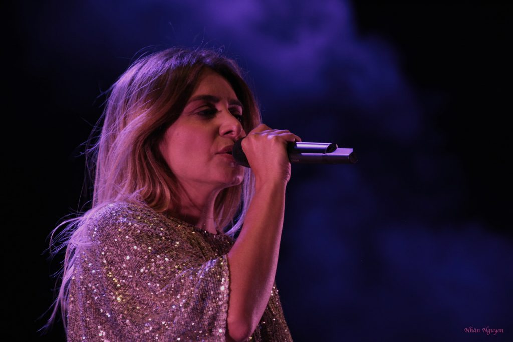 Pour clore cette soirée, c’est Julie Zenatti qui, dans une robe étincelante, prend possession de la scène et du public dont certains ont attendu dès l’ouverture au pied du podium. Tout commence sur le timbre de sa voix tout en douceur. Puis la douceur dérive, elle se transforme en boule d’énergie, en flamme écarlate bondissante qui sautille et qui pétille. Elle invite alors le public à se rapprocher, à l’approcher, pour profiter intégralement de son spectacle et danser sur l’herbe du parc du Château. Elle pénètre ensuite dans une boule à facettes qui l’enveloppe tel un cocon, puis elle nous entraîne dans un rêve de douceur avant de terminer son impressionnant concert.