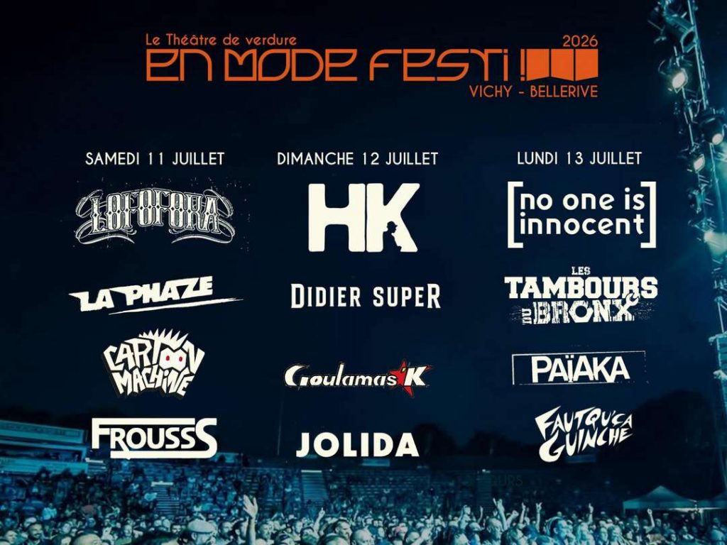 L’an dernier naquit ce petit festival aux allures de grand : En Mode Festi. Il s’est installé paisiblement dans l’enceinte du Théâtre de verdure de Bellerive-sur-Allier, à une traversée de rivière de Vichy. Avec Sandrine et Guiz, nous y assistâmes et le savourâmes. Eh oui, je vous parle d’un passé simple au passé simple. Mais laissons l’antérieur et intéressons-nous au futur. C’est à l’été 2026, du Samedi 11 au lundi 13 juillet – veille du 14, pour les amateurs de ponts comme celui évoqué précédemment – que cette deuxième édition se tiendra. Sur trois soirées, il nous offrira une programmation dont on pressent un caractère époustouflant, des concerts à déguster entre gourmets. C’est tout du moins ce qu’augurent les premiers noms révélés en cette période de fêtes. Il va de soi que nous répertorierons la suite quand celle-ci sera connue. D’ailleurs, en plus des trois annoncés, il en est un qui a fuité, essayez de deviner lequel.