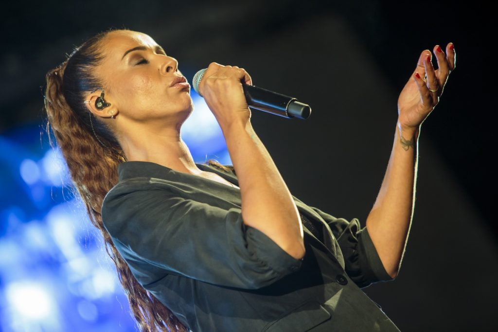 Puis ce fut au tour de Chimène Badi de monter sur scène et d’émerveiller le public avec son « tube » Entre nous. Elle a continué durant un petit moment à faire chanter et danser les personnes, tantôt sous la pluie, tantôt sans la pluie.