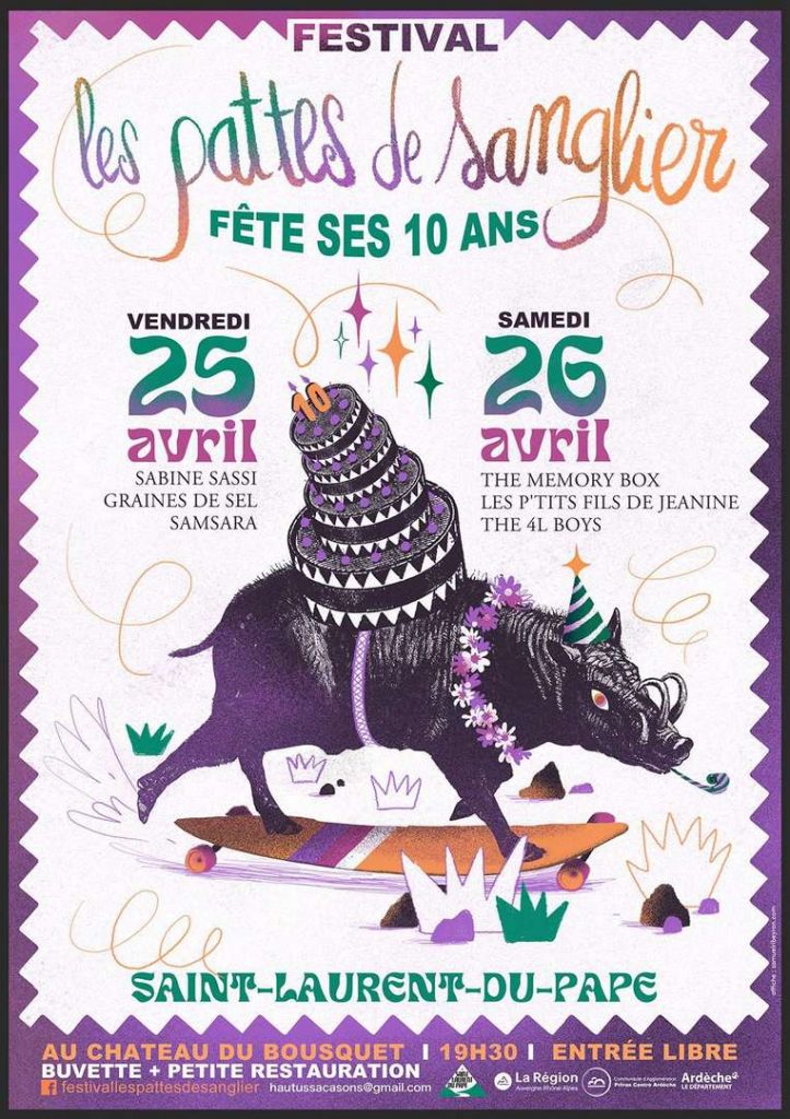 Le Festival pattes de Sanglier va fêter ses dix ans en 2025. Et pour l’occasion, il a décidé de mettre les bouchées doubles ! En effet, cette année, il passe d’une à deux soirées. Et le tarif reste inchangé puisqu’il est en entrée libre. C’est donc les vendredi 25 et samedi 26 avril, dès 19 h 30, que se tiendra cet événement ardéchois organisé par l’association Hautus’Sac-à-Sons. Le parc du Château du Bousquet, à Saint-Laurent-du-Pape, accueillera les nombreux festivaliers dans une ambiance des plus chaleureuses. La programmation, comme à l’accoutumée, est des plus festives et les six groupes invités vous feront vibrer avec grand plaisir. Vous trouverez, bien entendu, tout ce qu’il vous faudra sur place pour vous ravitailler en nourriture et boissons. Les différents hébergements sur la commune seront là pour vous éviter de reprendre la route après les soirées, mais pensez à réserver.