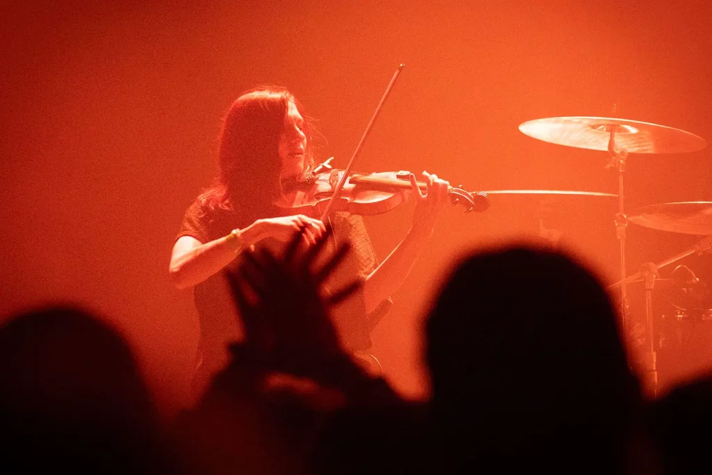 21 h 02 : C’est l’heure de Fall In Place. Sur l’intro du morceau, Titou joue de sa guitare avec un archet et sur le final le groupe entoure Rems.