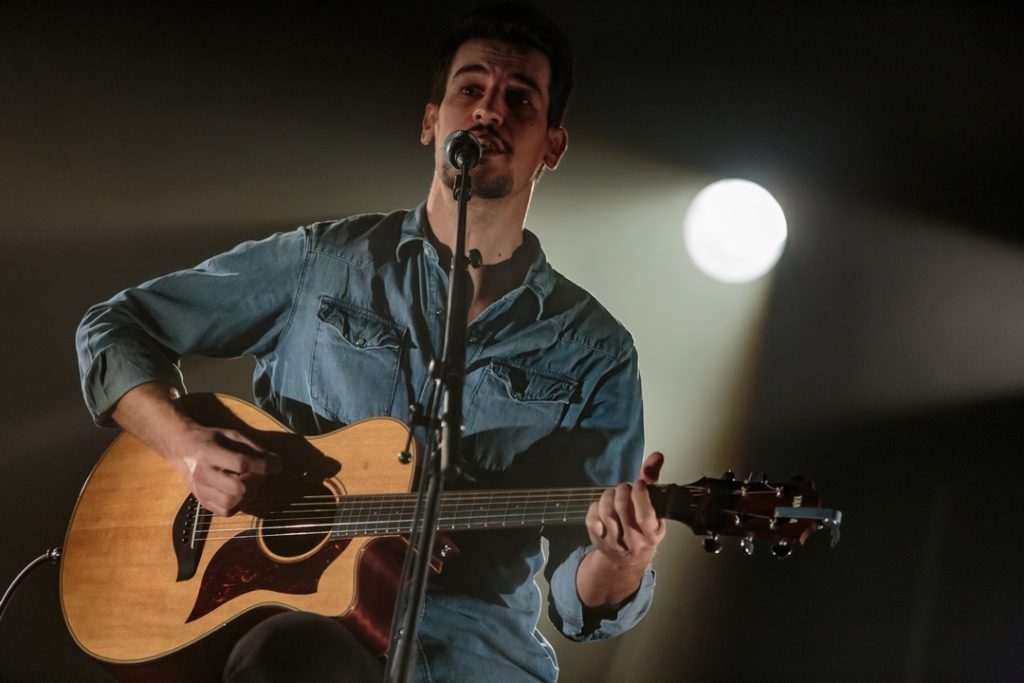 Puis vint le temps de la montée sur scène de la tête d’affiche de la soirée, Romain Humeau. Il s’est installé tranquillement sur son strapontin, a saisi sa guitare et a commencé à jouer. Ce fut un véritable moment fusionnel avec son public, dont certains le suivent depuis ses débuts. Il a chanté, pour le plus grand bonheur de tous. Il a fait quelques reprises, dont une interprétation absolument merveilleuse du Plat Pays de Jacques Brel, mais il a aussi joué des morceaux d’Eiffel et quelques uns de ses débuts. Ce fut un pur moment de plaisir. Un concert comme on les aime : intimiste et grandiose ! Nous ne le connaissions pas encore sur scène et force est de constater que, désormais, nous avons hâte de l’y revoir.