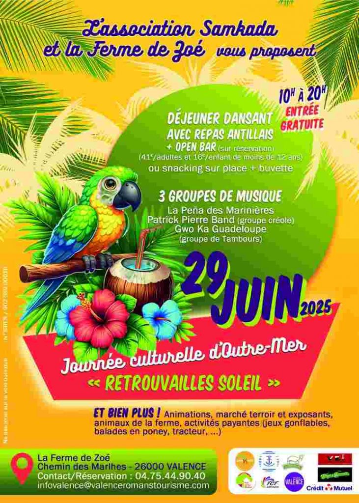 Samkada, c’est un acronyme pour : « Solidarité Afro Métro Kréole Association Drôme Ardèche ». Elle est basée à Valence et a pour objet d’apporter du soleil en métropole et, surtout, de réunir les personnes originaires des départements, régions et collectivités d’Outre-Mer. Le dimanche 29 juin 2025, de 10 h 00 à 20 h 00, elle organisera, en collaboration avec La Ferme de Zoé – qui vous accueillera –, un événement sur toute la journée et dont l’entrée sera gratuite, lequel est intitulé « Journée culturelle d’Outre-Mer » et sous-titrée « Retrouvailles Soleil ». Outre de nombreuses activités gratuites et payantes, un déjeuner dansant avec repas antillais – et open bar – à 41 euros pour les adultes et 16 euros pour les moins de douze ans vous sera proposé sur réservation. Pour celles et ceux qui n’auraient pas eu le temps ou l’envie de réserver, il sera toujours possible de vous sustenter avec du snacking et de vous abreuver grâce à la buvette. Trois formations musicales sont invitées pour animer votre journée.
