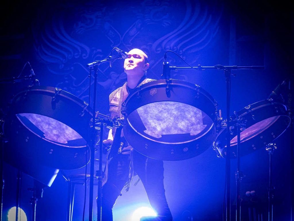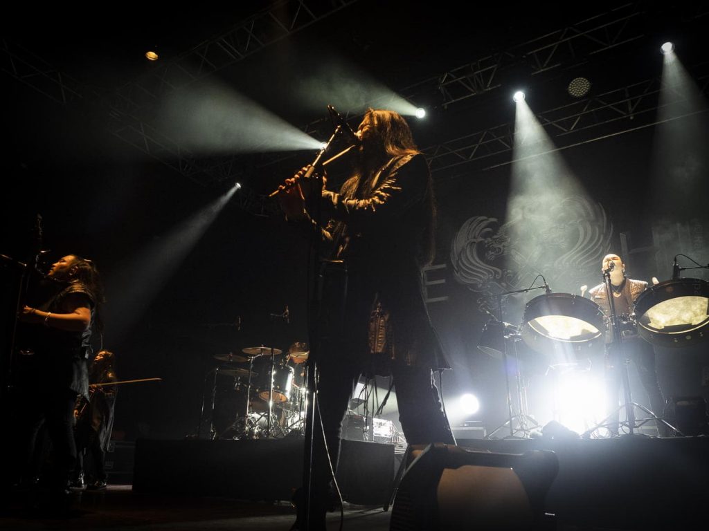 Ils attaquent la soirée avec Shihi Hutu tiré de leur dernier album. Shoog Shoog que le public scande en chœur en levant le poing en rythme. The Gereg (titre agrémenté de guimbarde en plus des instruments traditionnels). Quelques mots de leur part : « Bonjour Lyon » en Français avant qu’elles mots en anglais puis « merci beaucoup » ce qui fait beaucoup plaisir au public ! Ils reprennent avec Hohochu Zairan. « And now the great Chinggis Khaan » suivi de THE TRIANGLE (Uchirtai Gurav en VO) titre somme toute plutôt rock sur lequel le public bat des mains en rythme puis Shireg Shireg où la flutte se pose doucement sur nos oreilles de ce titre folk. Ensuite vient le titre Bii Biyelgee. Ils annoncent le titre Tatar Warrior, ça headbang massivement dans la salle sur ce titre heavy ! Ils jouent avec le public en leur faisant scander « Hu » en rythme. Avant d’enchaîner avec leur titre phare Yuve Yuve. Puis Wolf Totem que les plus fans dans la salle ont reconnu à la première note, suivi de Black Thunder. Ils annoncent la chanson suivante : This is Mongol. Ils refont scander « Hu » en rythme à la salle. « Merci beaucoup, we love Lyon » Ils saluent le public et partent backstage. Le public scande de nouveau « Hu » en rythme pour les faire revenir. Et ils finissent par le faire pour un rappel (prévu sur leur setlist, comme le plus souvent). Ça sera Sad But true, leur efficace reprise du titre iconique de Metallica.