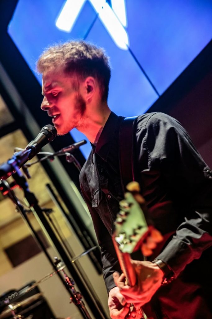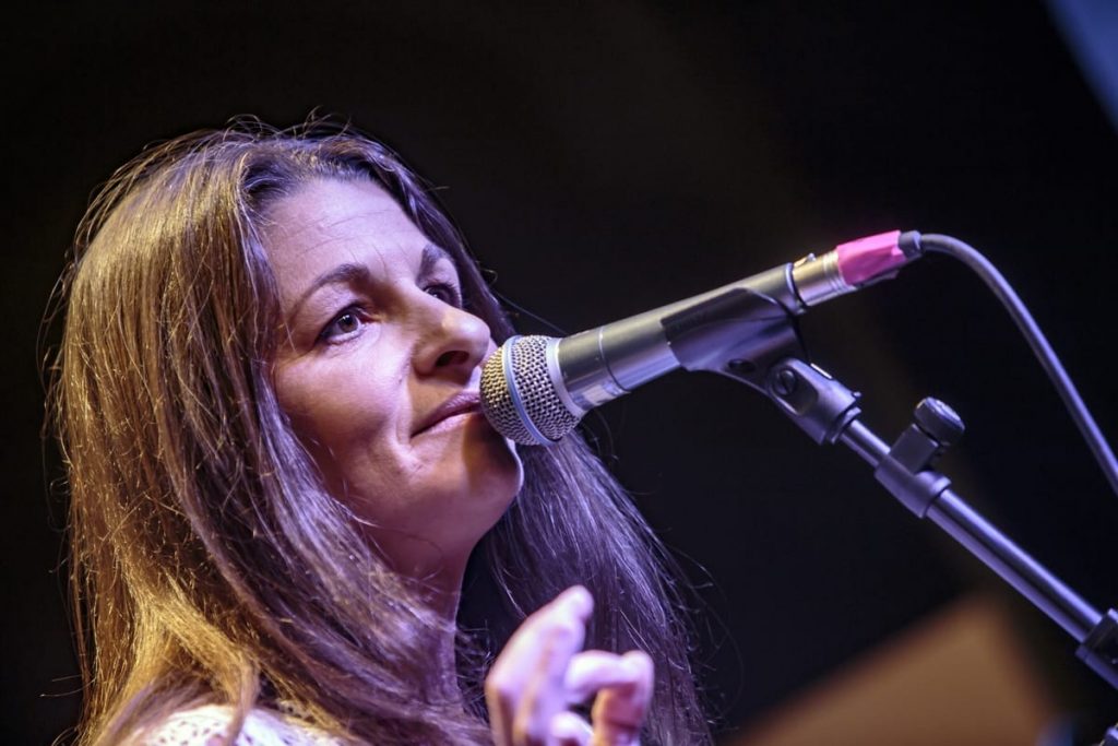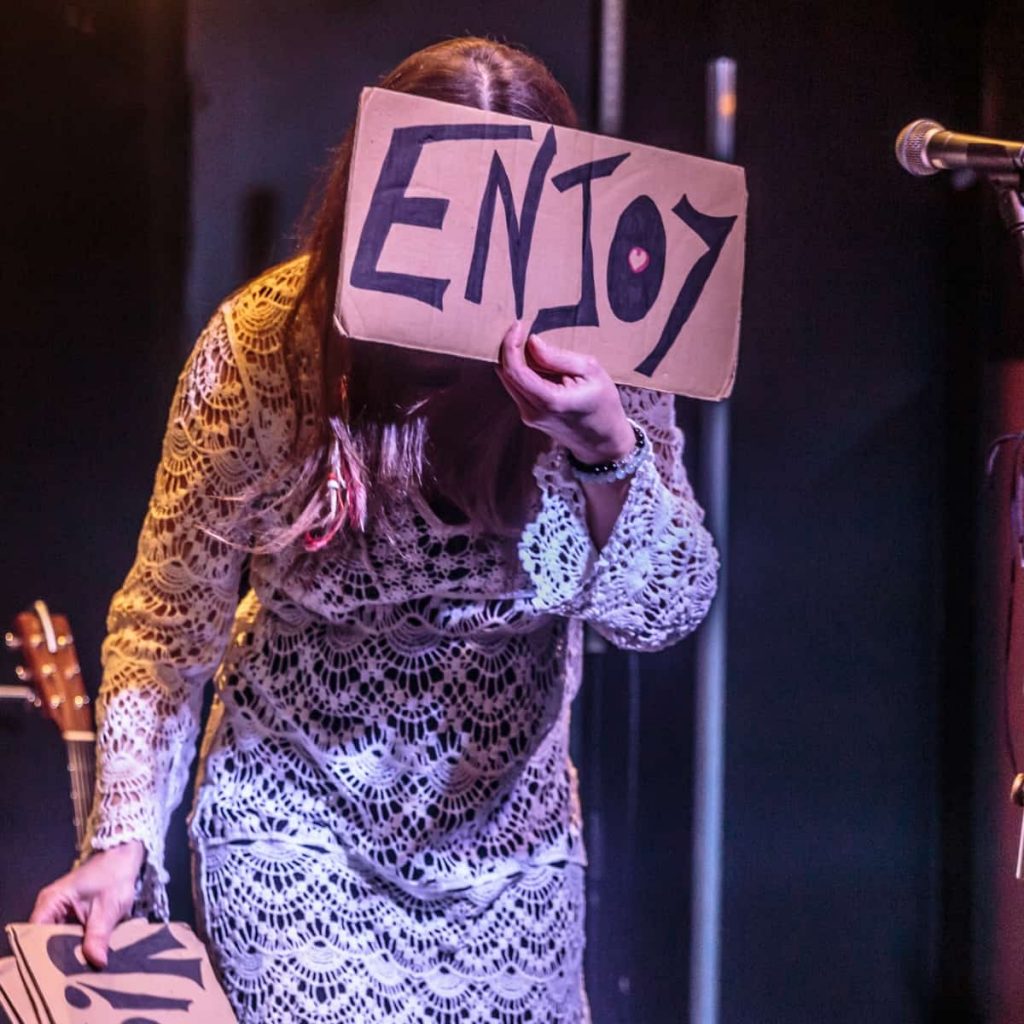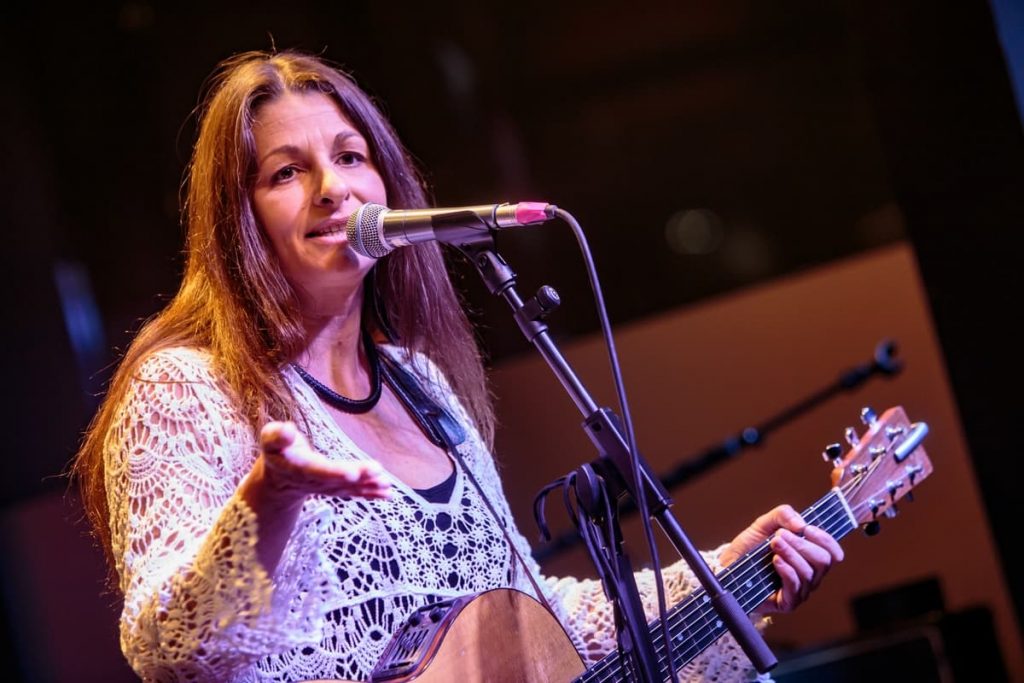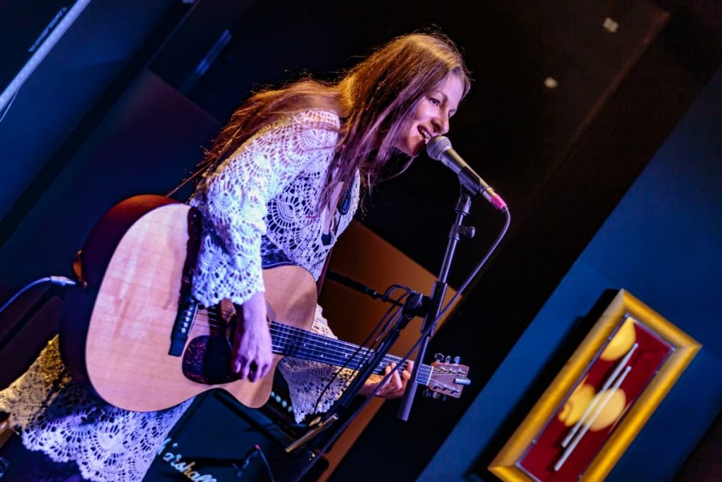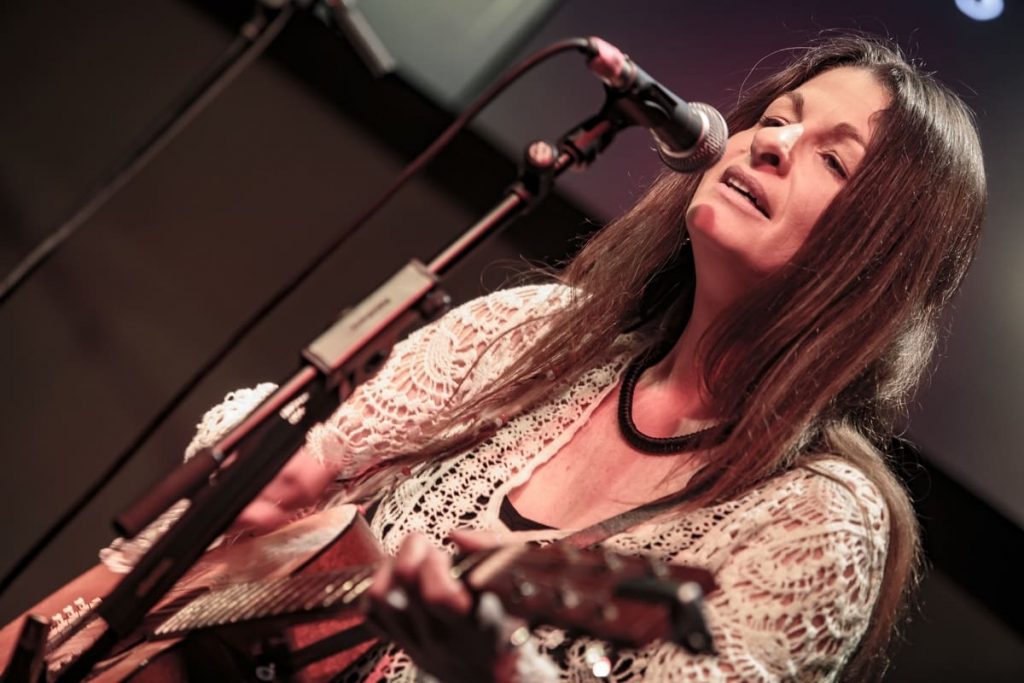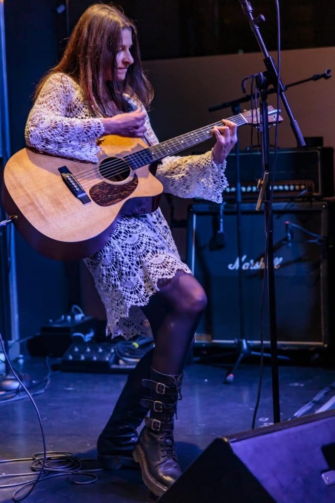20 h 05 Nat après avoir joué avec le public et des panneaux tels ceux utilisés par les autostoppeurs, attaque à la guitare sèche. Elle est contente de rejouer dans sa ville natale ! Nous avons eu droit à différents titres de son répertoire dont une chanson qui parle des cinq accords toltèques. Ensuite, dans la vie, il ne faut pas fuir l’orage il faut apprendre à danser sous la pluie, quoi de mieux pour ça qu’une chanson qui s’appelle Danser sous l’orage ? La suivante nous invite à nous reconnecter avec notre petit enfant intérieur « De la joie dans les orteils et un, deux, trois, soleil ! » puis en ces temps complexes et chaotiques, une chanson sur la paix : J’ai choisi la paix. Et une chanson sur la lune car c’est la pleine lune ce soir. Mes contradictions avec du kazoo. La suivante s’appelle Mandala : « Tout vas bien se passer ». La petite dernière sur laquelle elle a demandé au public d’être concentré. Elle remercie MusiKenScene (MKS) production et Trigones Plus de l’avoir invitée, son ingé son (et lumière), l’équipe du HRC et le public bien sûr. Et nous avons droit à une autre chanson pour terminer ! A 20 h 42 c’est l’heure du rappel ! Question existentielle en ce soir de pleine de lune : Est-ce que je suis les autres ou Est-ce que je suis moi ? Il est 20 h 46, c’est la fin de cette première partie qui fut une plaisante découverte ! On peut trouver à Nat un petit air de Janis Joplin. Nous lui souhaitons de mieux finir en tout cas !