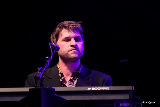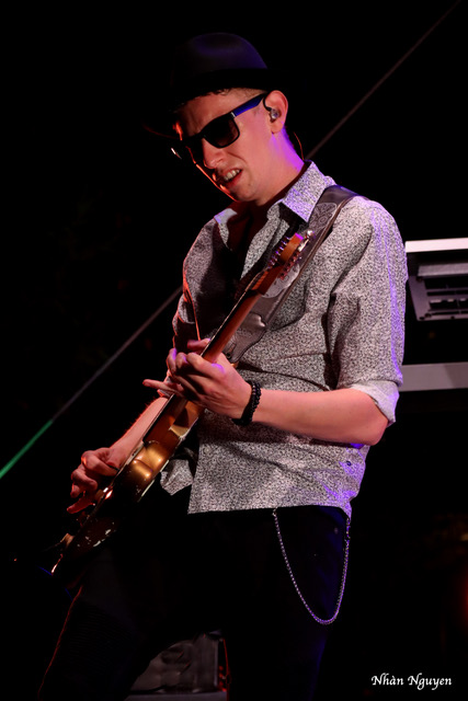 En rouge et noir, non comme son ainée Jeanne, encore moins des idées décrites par Stendal, lunettes noires sur le nez, Amandyn Roses arrive, sobrement vêtue d’une robe noire, chaussée de baskets super branchées rouges. Classe ! Mais quel dynamisme. C’est parti pour du rock pas trop métal comme certains le prédisaient, mais du rock qui fait du bien, qui fait approcher les timides de la scène pour piétiner la pelouse du château. Un clavier (Thibaud Lecluse), une batterie (Guillaume Pihet), une basse (Pili Tempo) et une guitare (Charlie Fabert) accompagnent cette voix forte et douce à la fois dont je me disais qu’elle pourrait nous faire un Summer time à la Janis Joplin. Mais ce n’était pas au programme. Cela n’a pas empêché l’atmosphère de s’échauffer pour que notre vedette nous montre son regard perçant en se débarrassant de ses lunettes noires pour bouger au rythme de la guitare majestueuse de Charlie Fabert qui descend au milieu de la foule pour un solo époustouflant !