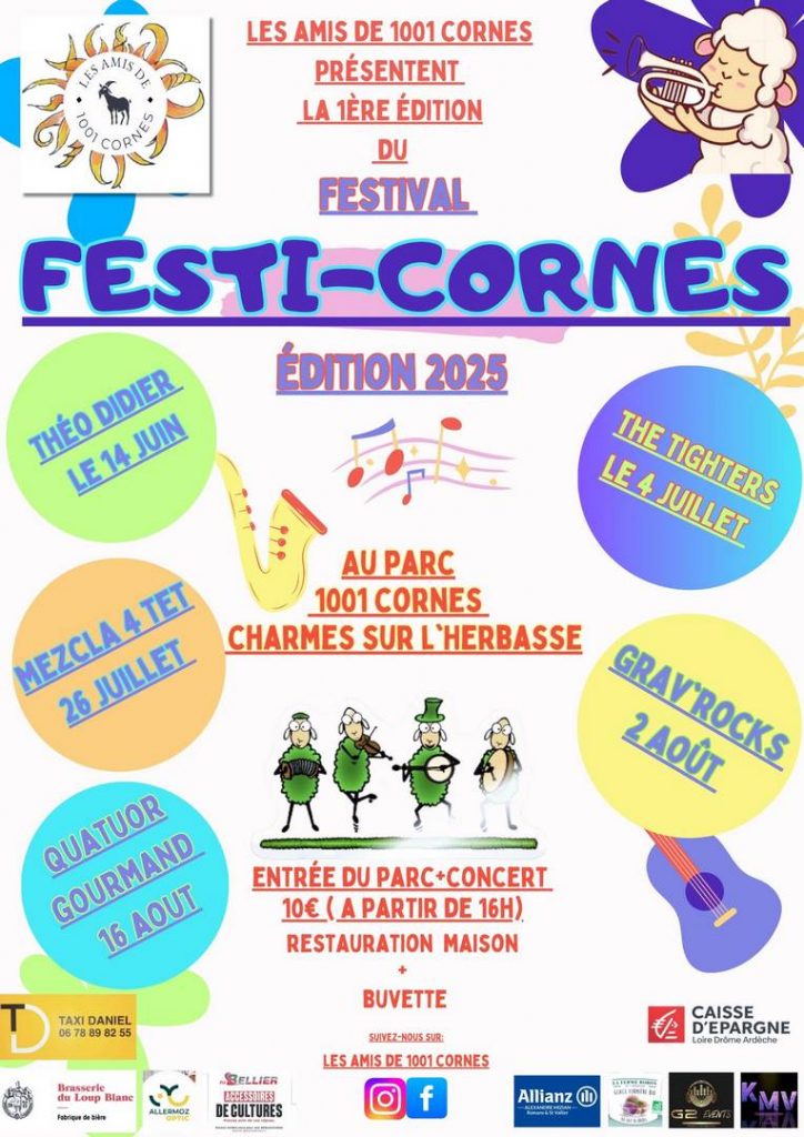 En cette année 2025, l’association Les Amis des 1001 cornes crée son événement, et c’est un festival ! Le Parc des 1001 cornes, sis sur la commune de Charmes-sur-l’Herbasse, dans la Drôme, accueillera tout au long de l’été pas moins de cinq soirées. Bienvenue donc au Festi-Cornes dans la sphère des festivals drômois ! L’accès au festival – et au parc – se fera dès 16 h 00 pour la somme de 10 euros. Tout sera disponible sur place afin de vous éviter toute déshydratation.