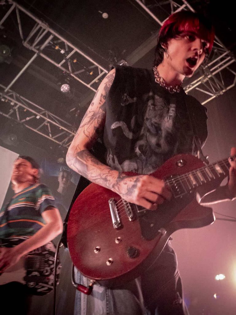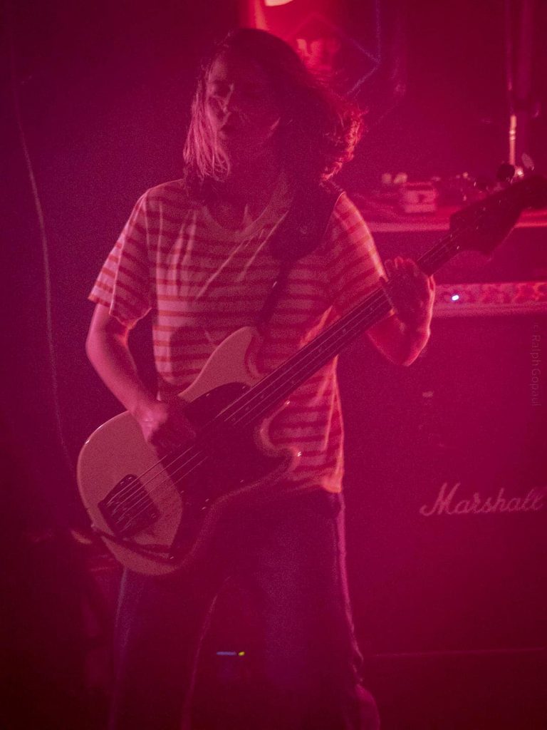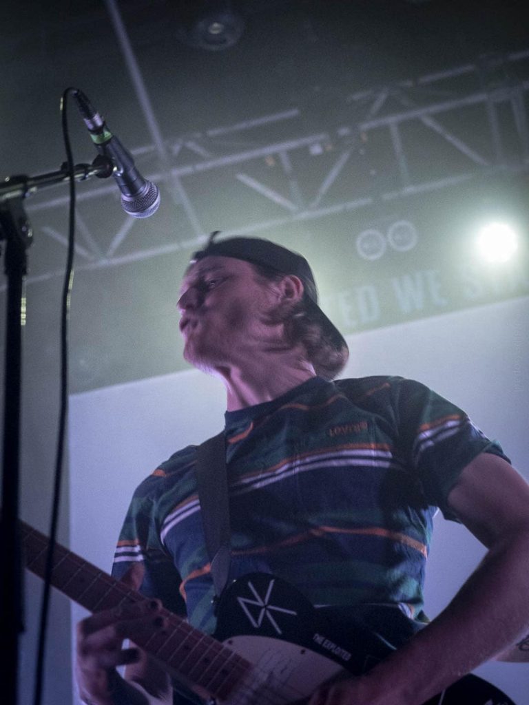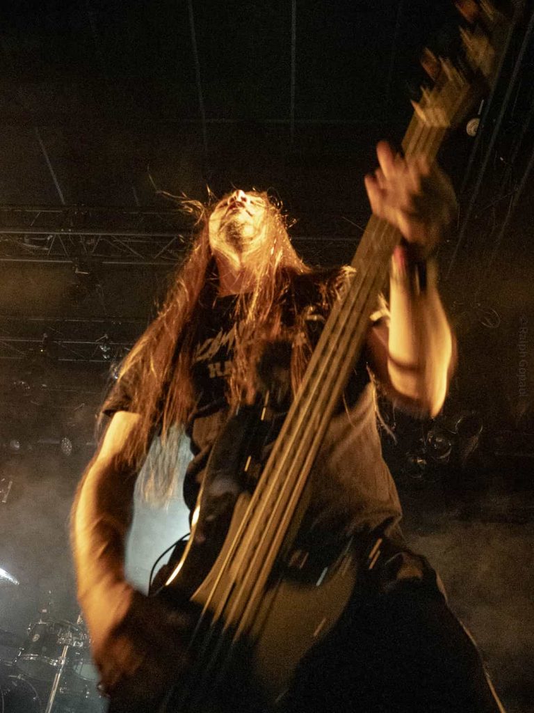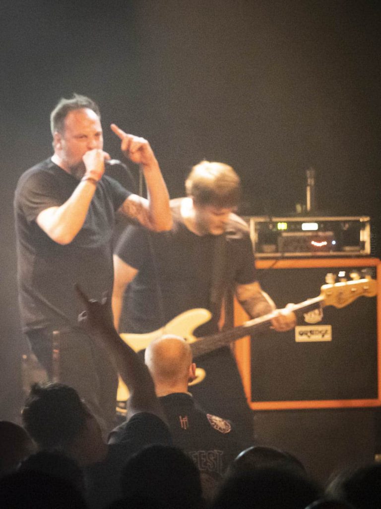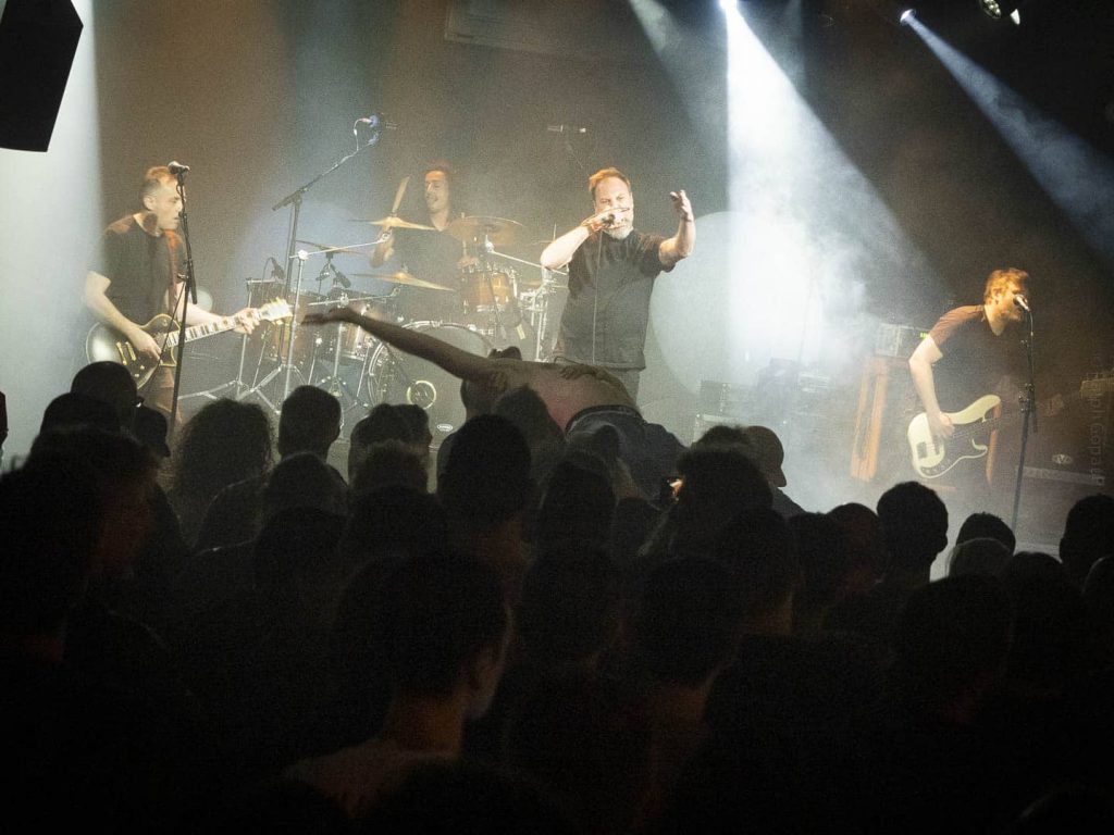 23 h 05 ils attaquent leur set ! Malgré l’heure avancée pour un soir de semaine ça pogote sec devant la scène ! Et Nicolas, le bassiste, descend jouer au milieu des pogoteurs !